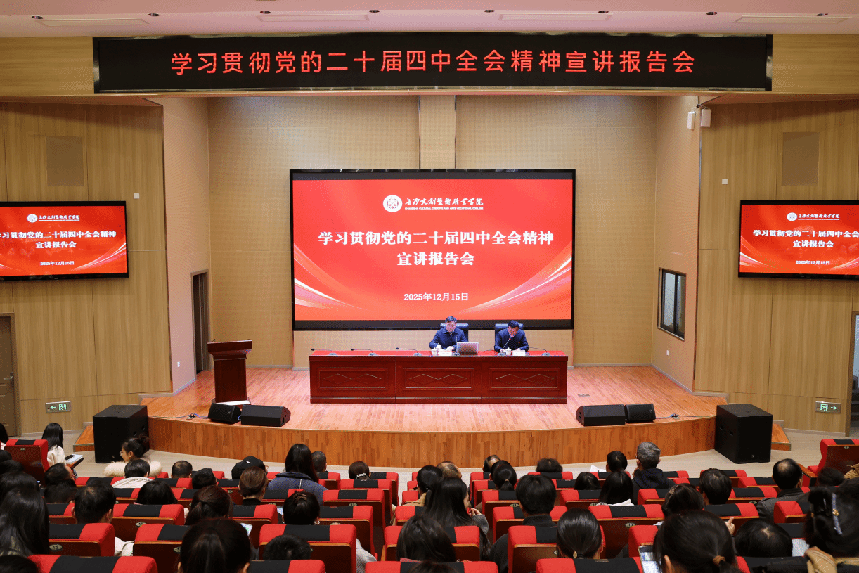 为全面深入学习领会党的二十届四中全会精神及省委十二届九次全会精神,推动党的创新理论深入人心、落地生根,12月15日,根据省委宣传部统一部署、省委教育工委具体安排,我校特邀学习贯彻党的二十届四中全会精神省委宣讲团成员、长沙师范学院党委书记胡穗来校作专题宣讲。我校党委书记朱元双出席并主持会议,全体校领导、中层干部及全体学生入党积极分子现场聆听学习。