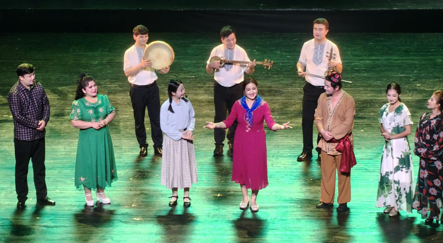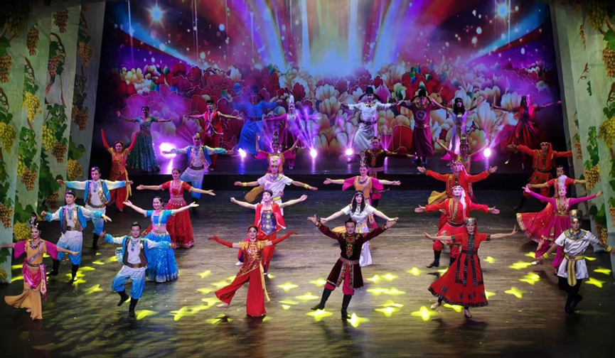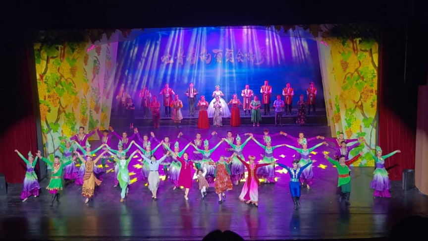 作为吐鲁番歌舞剧团精心打造的艺术精品,该剧以葡萄种植技艺传承为主线,串联起“丝路明珠吐鲁番”“翠蔓织梦——葡城的稼穑“等四个篇章,讲述了湘吐两地“葡萄奶奶”用一生培育葡萄、浇灌民族团结之花的动人故事 。演出中,世界非物质文化遗产“吐鲁番木卡姆”与现代舞蹈语汇完美融合,《千年坎儿井》《吐鲁番情歌》等片段里,明快的节奏、灵动的舞姿与悠扬的旋律相映成趣,既保留了传统艺术的精髓,又赋予其当代审美特质。演员们以精湛的表演,将吐鲁番人民的热情质朴与丝路文化的厚重底蕴展现得淋漓尽致,让现场学生仿佛置身于火焰山下的葡萄绿洲。